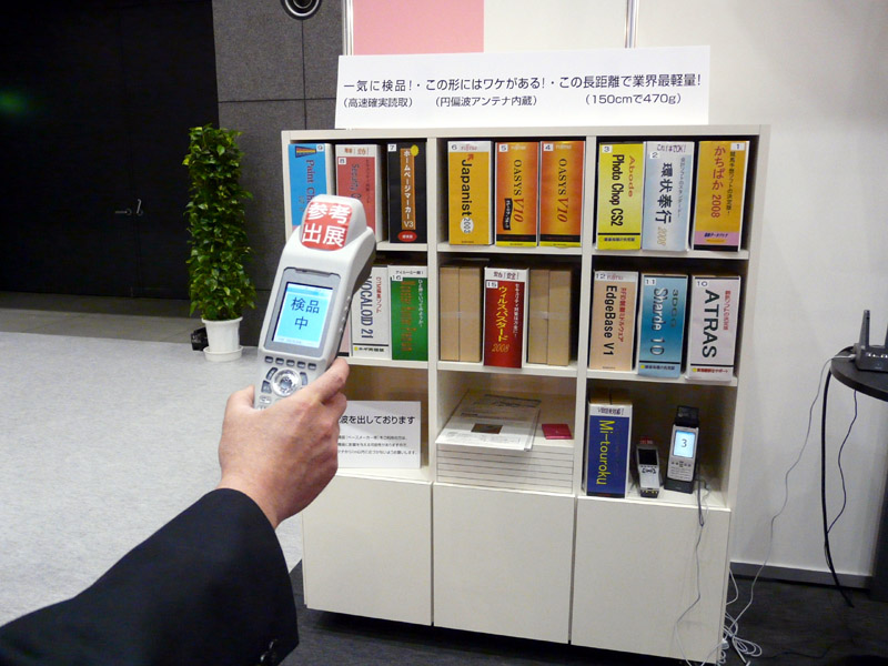 新開発のUHF帯ハンディロングリーダライタの実演。1メートル離れたところから大量のタグを瞬時に読みとる