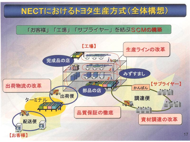 トヨタ生産方式の全体構想。サプライヤー間では「かんばん」によって必要な資材をほぼリアルタイムで調達し、生産ラインでは「みずすまし」と呼ばれる人が工場内で部品や完成品をの流通させる
