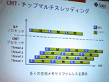 CMTを搭載するCPUは、75%のメモリ待ちの間に別の処理を行う。単純計算するとNonCMTのCPUが1つ処理を行って次の命令がメモリから来るのを待っている間に、CMTを積むCPUは4つの処理を並行して行うことができる。この場合のCPU使用率は、前者が25%、後者が100%だ。CMTは今後出荷が予定されているUltraSPARCに実装される。さらにCMTコアを複数持つUltraSPARCも順次開発される予定だ。